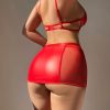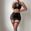 Sleek strappy underwire bra meets daring lace-up mini skirt with garters—bold mesh and faux leather blend for a fierce, seductive edge. Perfect for making a statement at nightclubs or intimate moments, this gothic-inspired set combines allure and attitude effortlessly.