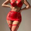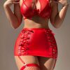 - 2-Piece Faux Leather Mesh Lingerie Set – Strappy Underwire Bra Lace-Up Mini Skirt with Garters – Sexy Gothic Clubwear for Women