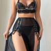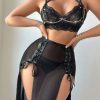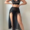 Elevate your intimate wardrobe with this captivating 3-piece black lingerie set—a bold fusion of gothic elegance and modern sensuality designed for the confident woman who isn’t afraid to make a statement. Crafted with meticulous attention to detail, this ensemble includes a strappy bra, a sheer mesh maxi skirt with alluring front lace-up slits, and a matching thong, creating a head-turning look that’s as empowering as it is seductive.