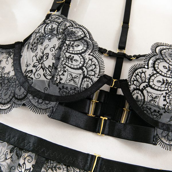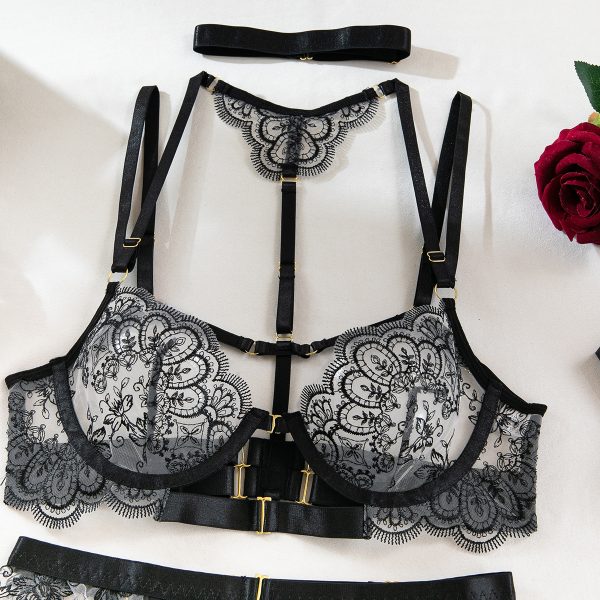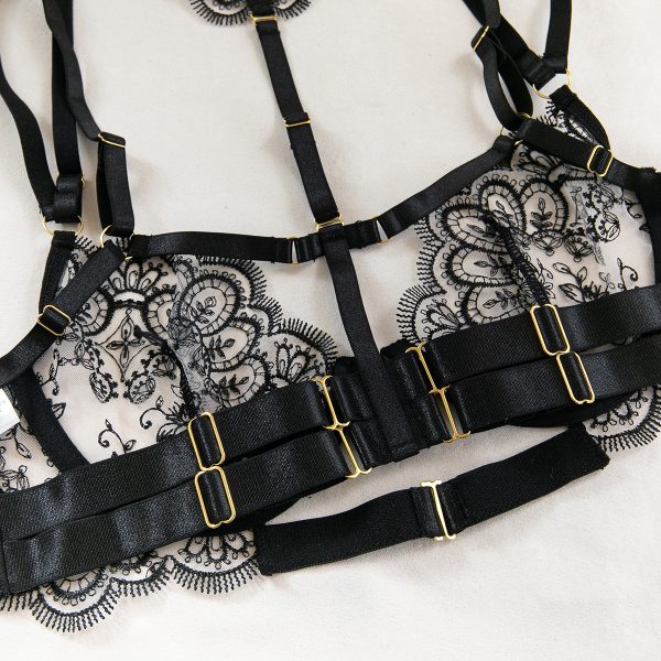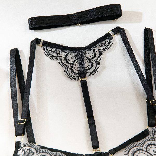 The set includes a beautifully structured underwire bra that offers gentle lift and support, contouring seamlessly to your shape for a flawless silhouette. Delicate floral lace overlays soft, breathable fabric, ensuring all-day comfort without sacrificing allure. The intricate strappy harness design adds a modern, edgy twist, drawing attention to your décolletage and enhancing your natural lines. Adjustable shoulder straps and multiple hook-and-eye closures in the back allow for a fully customizable fit, so you feel secure and confident no matter your size.