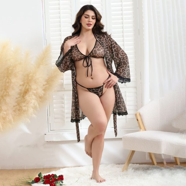 3-Piece Leopard Print Plus Size Lingerie Set with Robe – Sexy Sheer Mesh Babydoll & G-String Panties