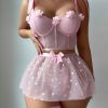 3 Piece Sweet Pink Lingerie Set with Heart Mesh Skirt – Floral Cup Bustier, Tulle Skirt Garter Thong
