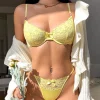 Paired with the matching thong, this set delivers a seamless, sultry finish. The low-rise thong is designed with a flexible satin waistband and minimal rear coverage for a barely-there feel, perfect for wearing under tight-fitting clothing or simply indulging in luxurious self-care. Subtle yet striking details—like dainty satin bows and shimmering metal ring accents at the center gore and waistband—add a playful, feminine touch that elevates the entire design.