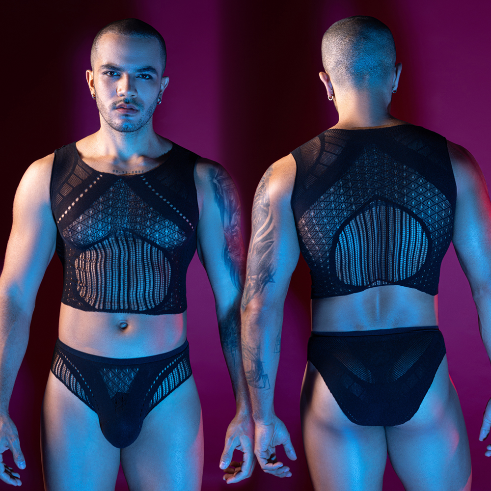 - Introduction:Turn up the heat with this 2-piece men’s erotic mesh lingerie set, featuring a sculpted sheer fishnet crop top paired with matching mesh bikini briefs. Designed to trace every muscle line, this stretchy and breathable mesh fabric enhances your physique while offering complete flexibility for dancing, modeling, club events, and intimate settings.The artistic geometric mesh pattern highlights the chest, abs, and back, while the low-rise briefs deliver a bold and seductive silhouette. Whether worn for private nights, photoshoots, festivals, or exotic performances, this outfit delivers unforgettable visual impact. Sexy, comfortable, and confidence-boosting—perfect for men who love daring fashion.