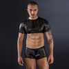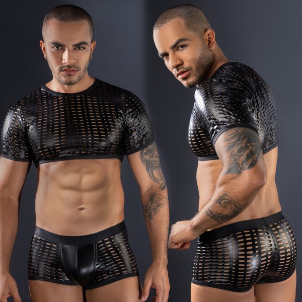- Introduction:Turn up the heat with this bold and modern Men’s Sexy Hollow-Out Mesh Lingerie Set, designed for confidence, seduction, and standout style. Featuring a glossy, leather-look short-sleeve crop top paired with breathable hollow-out boxer briefs, this two-piece outfit blends comfort with irresistible appeal.The shiny perforated material provides an eye-catching futuristic vibe, while the soft elastic waistband ensures a secure and flattering fit. Perfect for club nights, bedroom play, private performances, festivals, or anyone who loves daring fashion with an intimate touch. This set enhances the body’s natural lines, offering a perfect balance between exposure and style.Whether you’re looking to surprise your partner or elevate your personal collection, this exotic men’s outfit delivers confidence, comfort, and unforgettable visual impact.