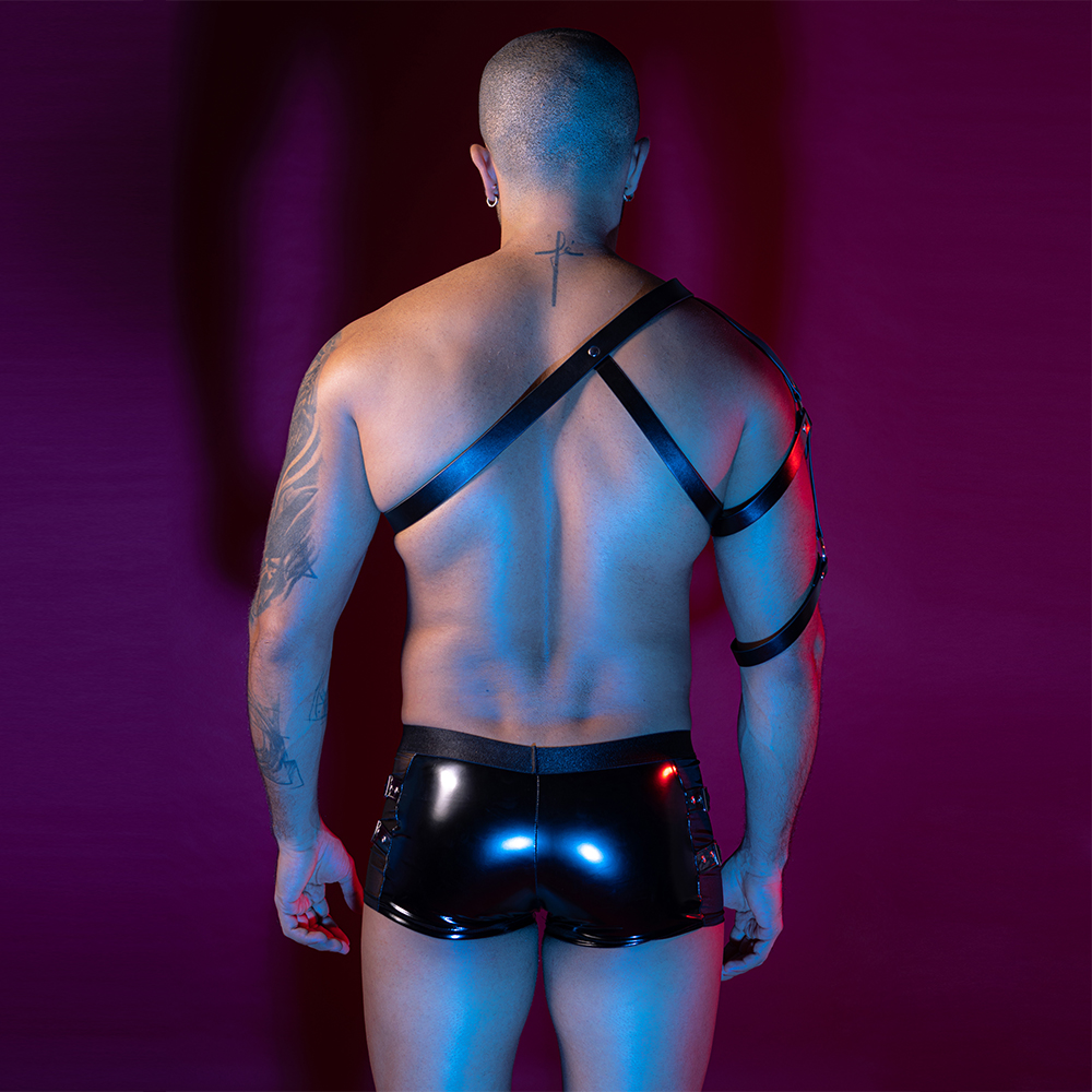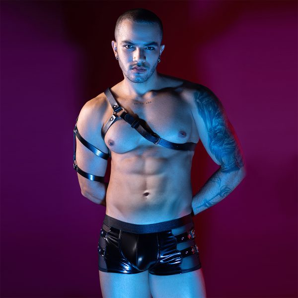 2. Introduction:Turn up the heat with this bold and seductive men’s PU leather lingerie set designed for those who love daring, dominant, and eye-catching fashion. Featuring a glossy wet-look finish combined with adjustable buckle straps on both sides, these sexy boxer shorts deliver a powerful mix of masculine energy and erotic appeal.The stretchy PU leather fabric hugs the body closely to highlight your natural lines, while the mesh paneling ensures breathability and comfort during extended wear. Whether you’re performing on stage, attending a nightclub event, role-playing, or creating an unforgettable surprise in the bedroom, this unique piece adds instant attitude and undeniable charisma.Perfect for men who enjoy fetish aesthetics, clubwear fashion, cosplay, or intimate moments with a partner.