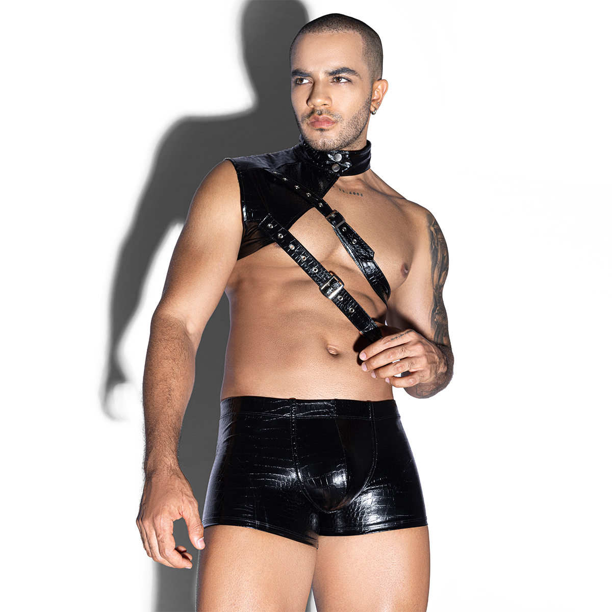 - Introduction:Turn up the heat with this striking men’s sexy faux-leather lingerie set, designed for bold confidence and irresistible appeal. Featuring a unique asymmetric one-shoulder harness design, high-shine crocodile-texture faux leather, and body-sculpting boxer shorts, this outfit elevates your roleplay, club night, or private fantasy scene with a powerful masculine edge.The stretchy material enhances your physique while delivering a snug, comfortable fit for all-night wear. Whether for fetish parties, bedroom seduction, cosplay, gogo dancing, or personal style exploration, this premium set delivers both attitude and allure.