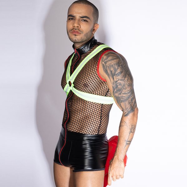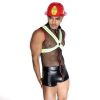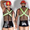 - Featuring a striking red-and-neon harness, mesh see-through vest, and faux-leather shorts, this set delivers an instantly recognizable and exciting firefighter fantasy look.