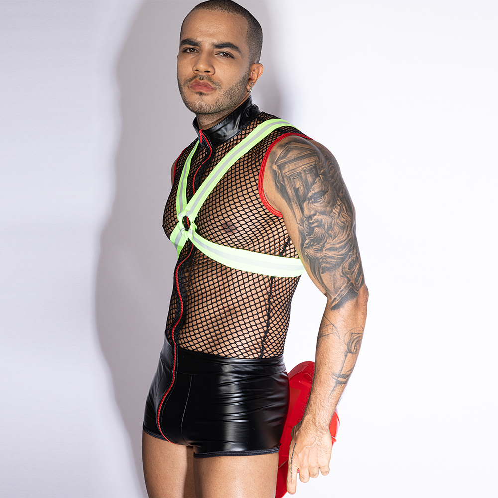 Introduction:Turn up the heat with this Men’s Firefighter Costume Lingerie Set, designed for bold personalities and unforgettable roleplay moments. The outfit pairs a breathable fishnet vest with a vibrant neon harness that wraps across the chest and back, creating a powerful and masculine silhouette. Paired with glossy faux-leather shorts featuring a sleek front zipper, this set combines comfort, stretch, and irresistible visual appeal.Whether you’re dressing for a themed party, nightclub event, festival performance, Halloween night, or playful intimate moments, this firefighter-inspired outfit guarantees attention. Lightweight, stretchy, and comfortable for extended wear, it’s a perfect blend of fun, fantasy, and fashion-forward sensuality.
