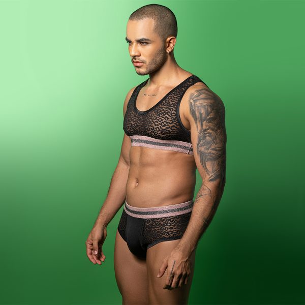 - Featuring a bold sheer leopard-pattern mesh, this 2-piece lingerie set creates an irresistible look that enhances masculine curves and boosts confidence for any intimate moment.