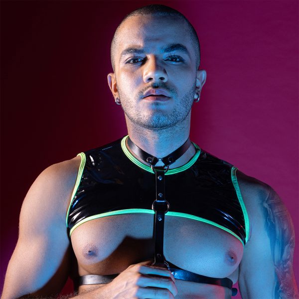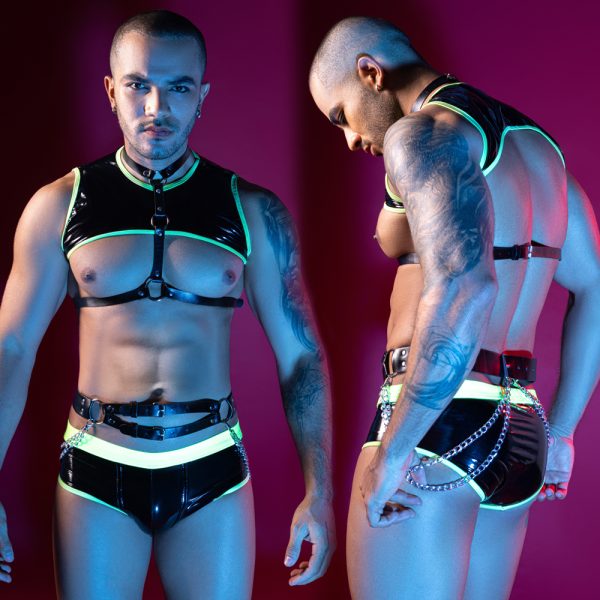 - Introduction:Turn up the heat with this bold and electrifying Men’s Neon Fetish Lingerie Set, designed for those who love to dominate the spotlight. Featuring a glossy PU leather crop top with neon edge piping, adjustable chest harness straps, and matching high-cut briefs enhanced with decorative metal chains, this outfit blends fetish aesthetics with eye-catching rave style.The structured harness enhances the chest and torso, while the elastic briefs offer a body-hugging fit that boosts confidence and masculine lines. Chain details along the hips add movement and seductive attitude, making it perfect for nightclubs, private parties, festivals, photoshoots, and intimate roleplay.Flexible, breathable, and durable, this set provides both comfort and dramatic visual impact—ideal for bold performers, dancers, and anyone who loves daring fashion