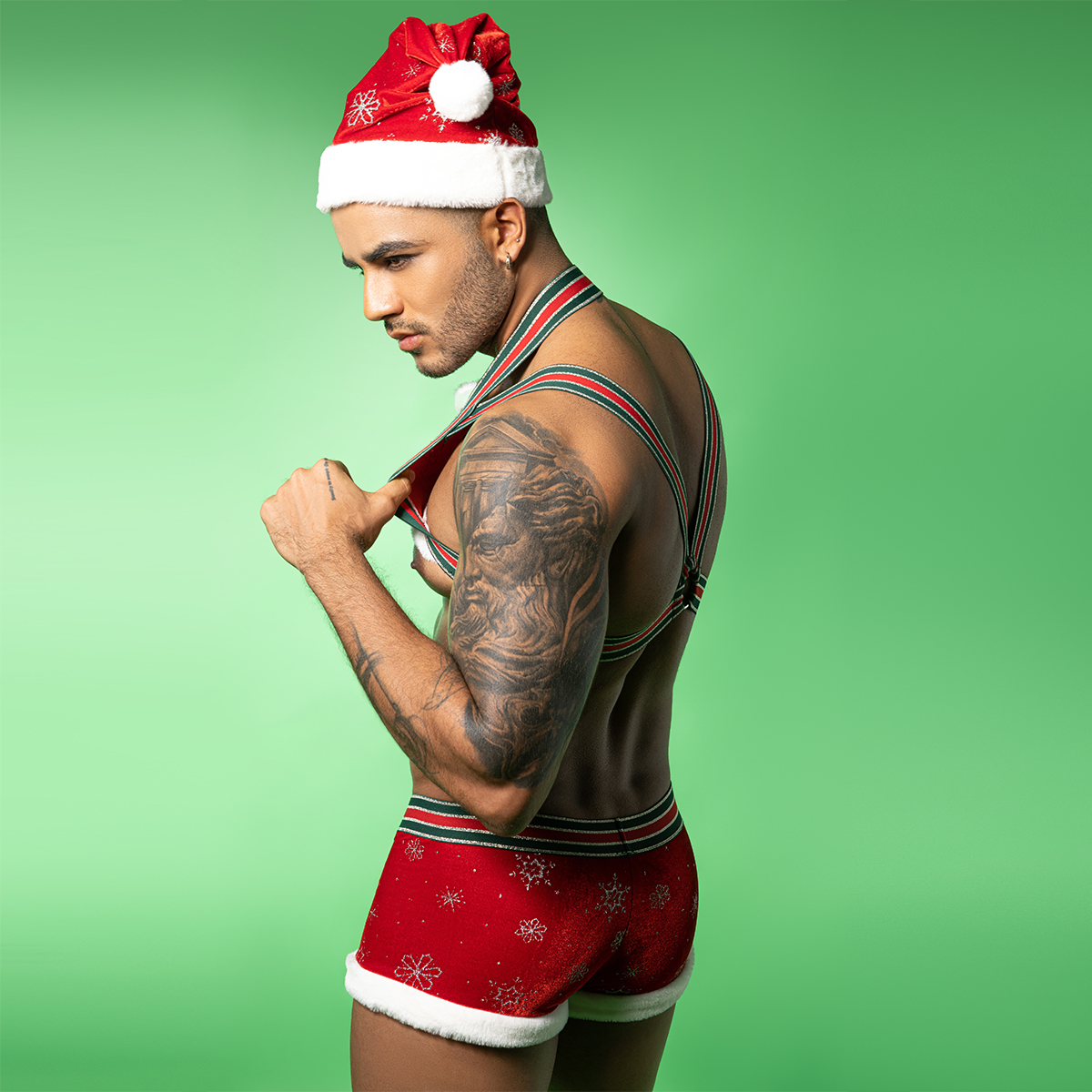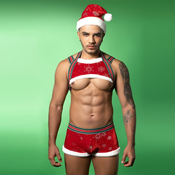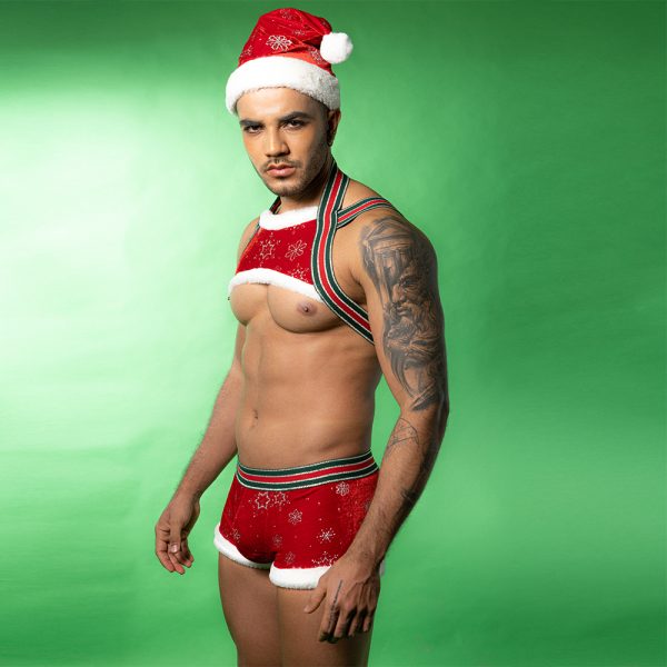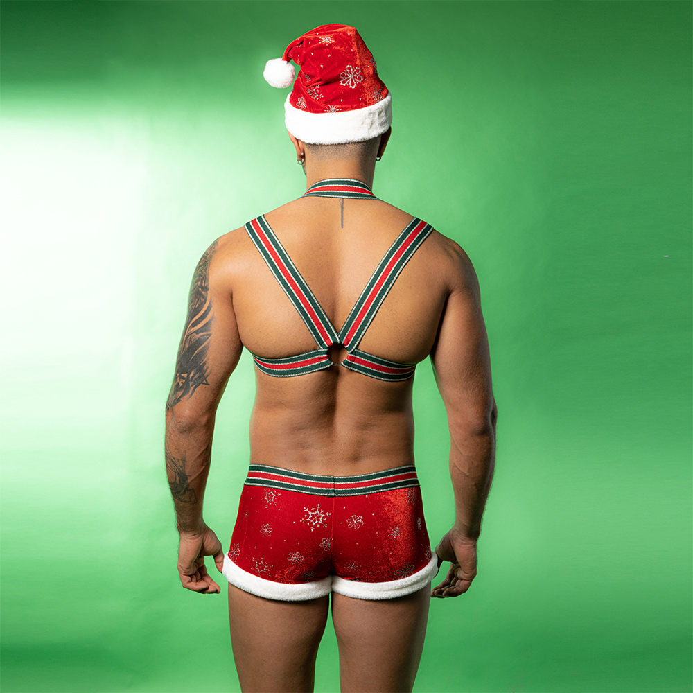- Introduction:Bring the holiday spirit to a whole new level with this bold and seductive Men’s Christmas Costume Set, featuring a festive red harness crop top and matching holiday shorts. Designed with a playful Santa-inspired theme, the outfit blends elastic comfort, fur-trim details, and shimmering snowflake patterns to deliver an irresistible look.The stretchy straps and body-hugging shorts enhance the masculine physique, making this set perfect for Christmas parties, photoshoots, cosplay events, or intimate festive nights. Whether you’re surprising a partner or entertaining at a themed event, this sexy Santa uniform adds excitement and confident charm to the holiday season.