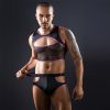 - The coordinated low-rise underwear includes smooth fabric and cut-out hips for enhanced visual appeal and comfortable movement.