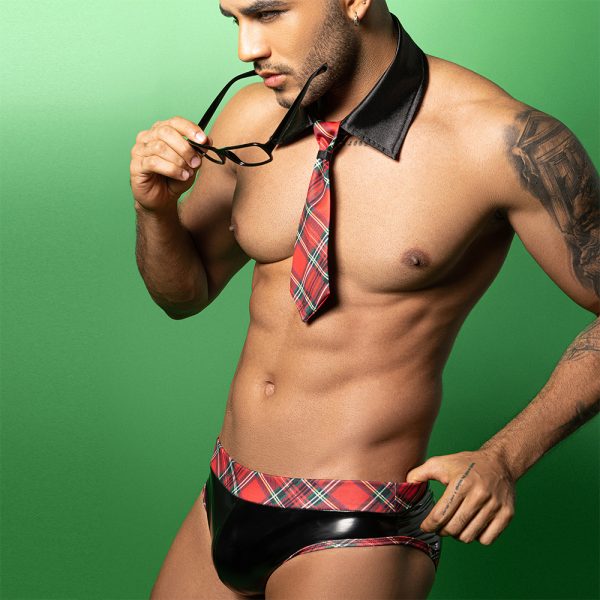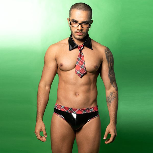 - Includes a faux-leather collar with adjustable buckle, matching plaid necktie, and glossy PU briefs for a seductive schoolboy look.
