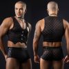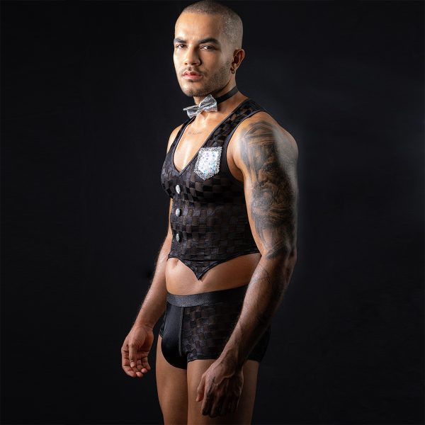 Introduction:Bring irresistible charm and bold masculine appeal into your next intimate moment with this Men’s Sexy Butler Costume Set. Designed with a unique checkered mesh pattern, this outfit blends elegance and seduction, perfect for roleplay, themed parties, or private bedroom fun. The cropped vest features a tailored tuxedo-inspired design with decorative buttons and a shimmering bow tie that instantly elevates your look. The matching mesh boxer briefs offer a comfortable stretch fit with semi-transparent panels that highlight your physique while maintaining a stylish and confident silhouette.Made from soft, breathable, high-elastic fabric, this men’s lingerie set ensures comfort and mobility whether you’re dancing, performing, or creating unforgettable intimate moments. Ideal for couples, cosplay enthusiasts, exotic dancers, and anyone looking to add a touch of provocative sophistication to their wardrobe.