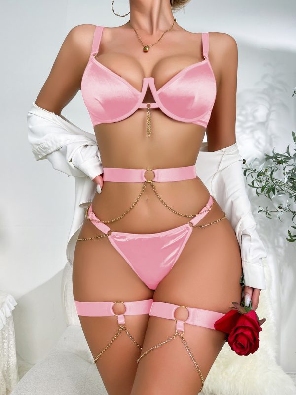 Sleek and seductive, this lingerie set blends soft pink velvet with shimmering gold chain accents for a bold yet luxurious look. The strappy design and leg harness add daring detail, perfect for making a statement with confidence and flair.