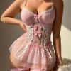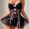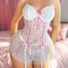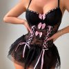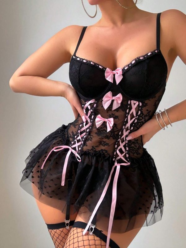 Playful Charm Lace Corset Lingerie – Mesh Babydoll with Satin Bows Heart Print Skirt (Black / Pink / White)