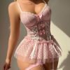 The corset top features a sweetheart neckline that enhances your bust while offering gentle support, framed by ultra-soft sheer mesh adorned with an enchanting heart print for a whimsical yet sensual touch. Delicate satin bows in dreamy pastel hues sit at the center and along the adjustable shoulder straps, adding a polished finish that contrasts beautifully with the intricate lace-up front. The crisscross lacing not only allows for a fully customizable fit but also accentuates your natural curves, delivering a flattering, waist-defining silhouette that flatters a wide range of body types.