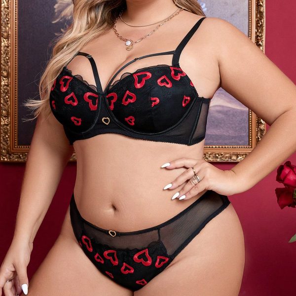 Plus Size Black Lingerie Set with Red Heart Embroidery – Mesh Bra Panty with Harness Straps