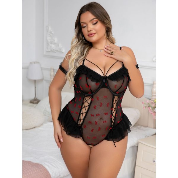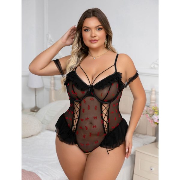 Plus Size Black Mesh Teddy with Red Bows – Sheer Lingerie Bodysuit with Frill Trim Lace-Up Detail