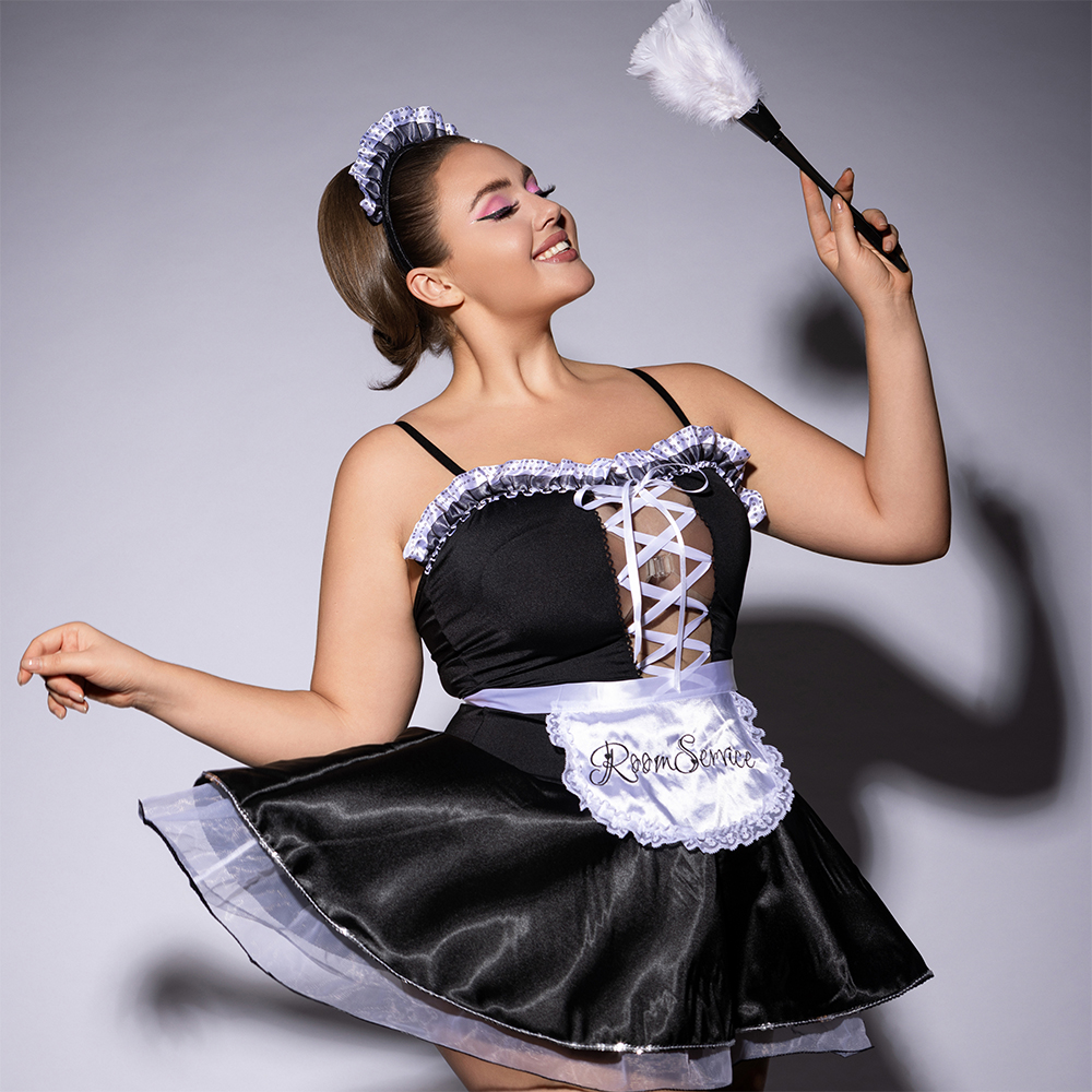 Embrace confidence and allure with this Plus Size French Maid Costume, expertly tailored for curvy women who love to command attention with playful sophistication. The seductive deep-V lace-up bodice offers adjustable cleavage control, while the flowing layered skirt adds graceful movement and feminine charm. Crafted from smooth, high-elastic fabric, the dress hugs your curves comfortably without sacrificing breathability—perfect for extended wear. Complete with a classic lace-trimmed apron featuring embroidered “Room Service,” a matching headband, and coordinating accessories, this ensemble delivers a fully immersive, head-turning look that’s both elegant and temptingly fun.