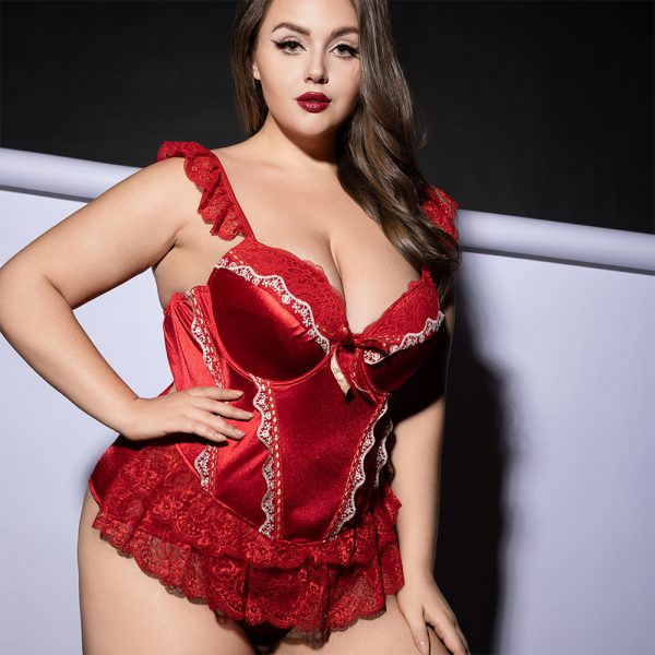 Introduction:Indulge in bold elegance with this Plus Size Red Satin Lace Corset Lingerie Set, crafted to accentuate the beauty of curvy women. Featuring smooth satin fabric, intricate floral lace panels, and romantic ruffled trim, this bustier bodysuit blends luxurious texture with irresistible sensuality.The push-up cups enhance your natural shape, while adjustable shoulder straps and a supportive structure provide a comfortable, tailored fit. Designed with figure-shaping lines and a flattering silhouette, this lingerie creates an alluring hourglass effect from every angle.Perfect for romantic evenings, bridal honeymoon nights, Valentine’s celebrations, boudoir photoshoots, cosplay, or themed costume play, this red lace corset delivers confidence, comfort, and captivating style. A must-have piece for every plus-size woman who loves to express her femininity with charm and seduction.