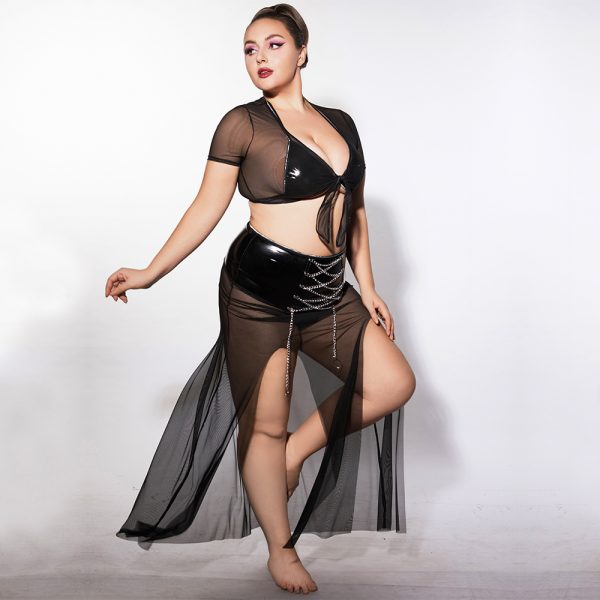 - Introduction:Turn heads with this Plus Size Sheer Mesh Two-Piece Skirt Set, designed to highlight your curves with confidence and elegance. The glossy black tie-front crop top pairs perfectly with the flowing transparent maxi skirt, featuring dramatic double high slits that move beautifully with every step.Metallic waist chains add an irresistible fashion-forward edge, making this outfit ideal for bold fashion lovers. Crafted from soft, stretchy mesh fabric, it offers maximum comfort and body-hugging fit while maintaining breathability. Whether you’re wearing it for lingerie styling, club nights, performances, or intimate moments, this set delivers a stunning blend of sensuality, glamour, and sophistication.Perfect for women who want to express confidence, allure, and individuality.
