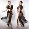 - Long transparent mesh skirt with double high slits provides dramatic movement and breathability while highlighting the legs.