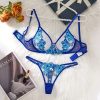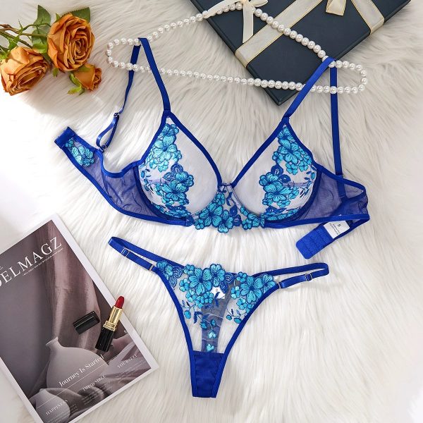 Sexy Blue Floral Embroidered Lingerie Set for Women – Sheer Mesh Bra and Thong Panty, 2-Piece See-Through Bra Set with Underwire Double Straps