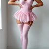 Completing the ensemble is a flirty lace-trimmed tutu skirt made from layers of ultra-soft tulle. Lightweight and airy, the skirt adds just the right amount of volume—swaying with a dreamy, ethereal motion that enhances your presence whether you’re stepping into a boudoir moment or a themed evening event. The matching bow choker brings the entire aesthetic together, blending innocence with daring elegance. Tied delicately at the nape, it draws attention to the neckline and completes the cohesive, fashion-forward design.