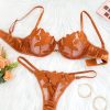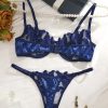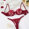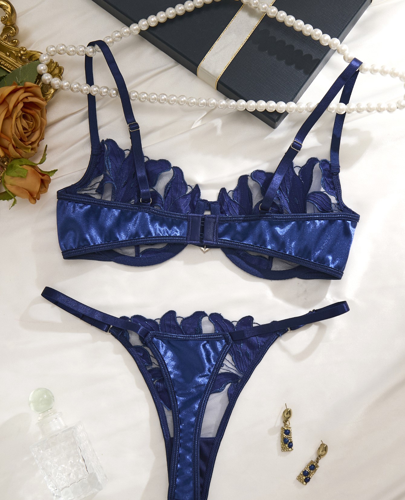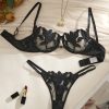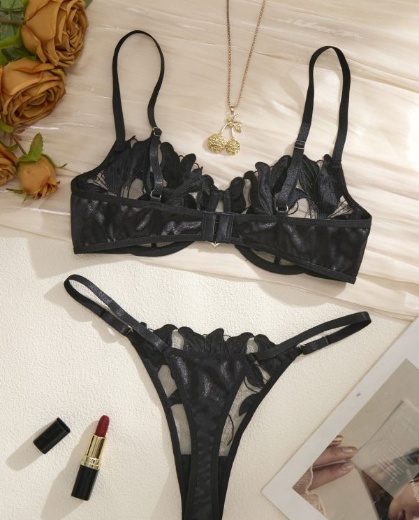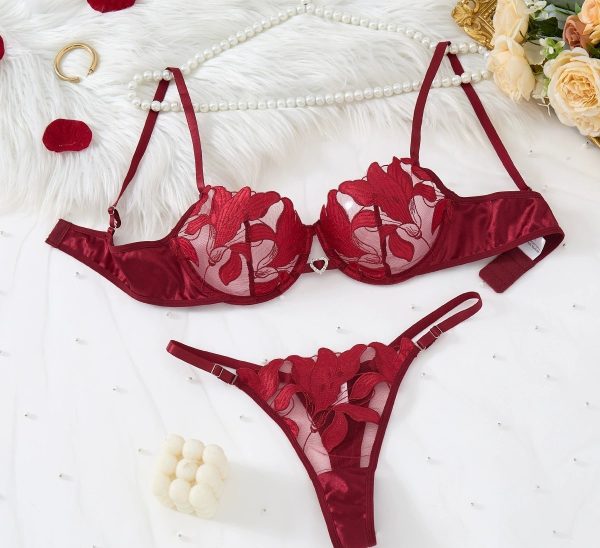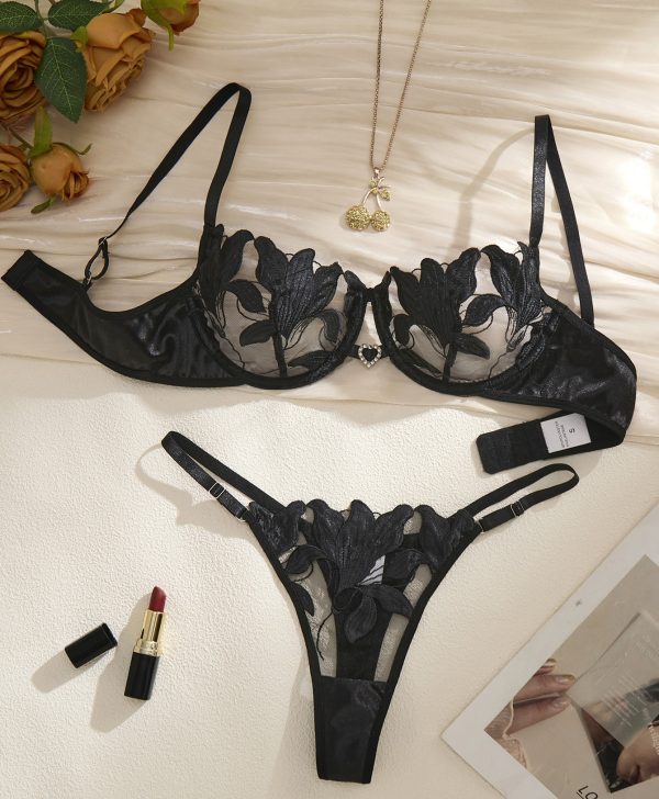 Sexy Embroidered Floral Sheer Lingerie Set – 2 Piece See-Through Bra Thong Panty, Adjustable Straps, Heart Charm, Exotic Underwear for Women