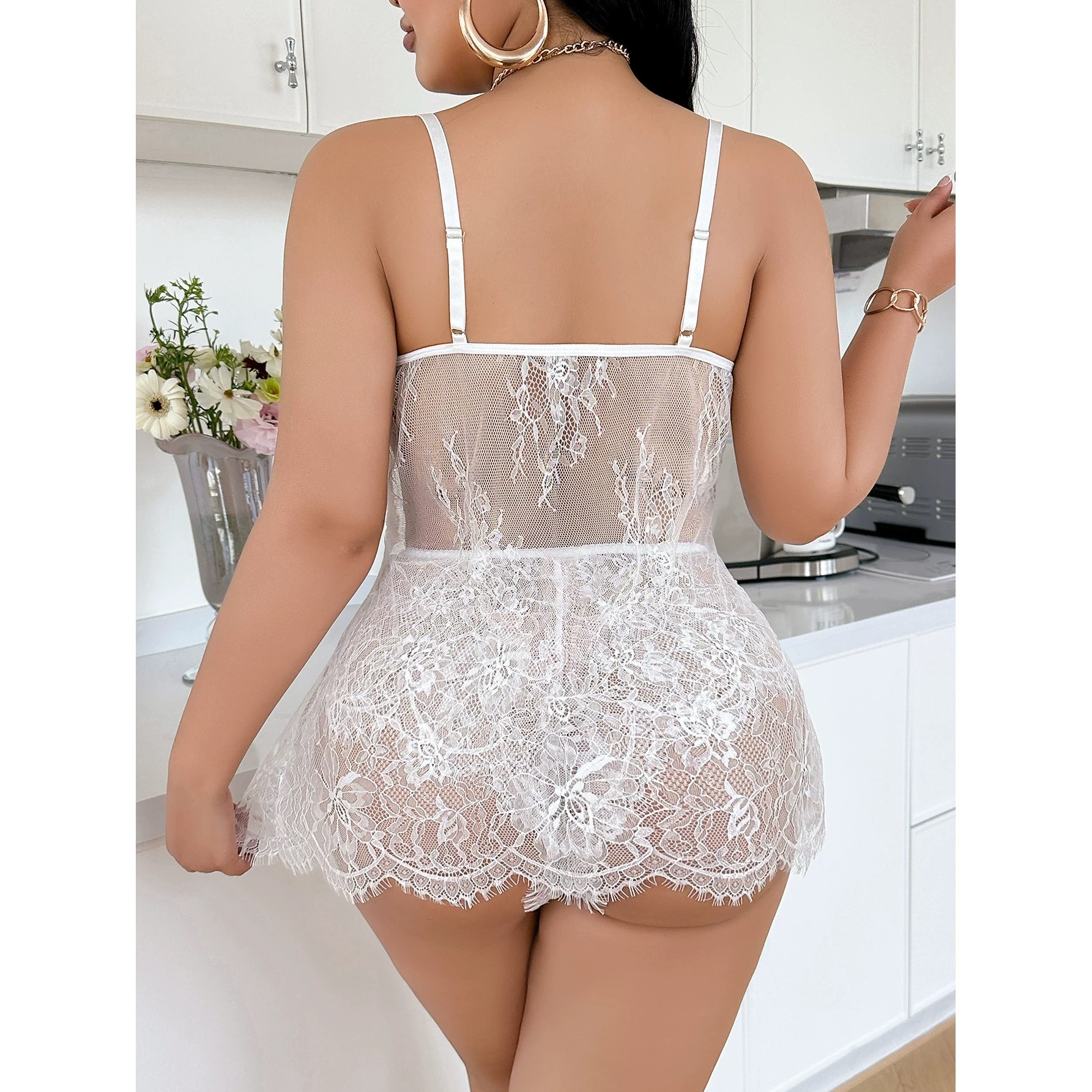 Feel effortlessly alluring in this sheer white babydoll, where delicate floral lace and a seductive lace-up front meet soft elegance. Adjustable straps ensure a perfect fit, making it ideal for intimate moments that linger in memory.