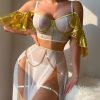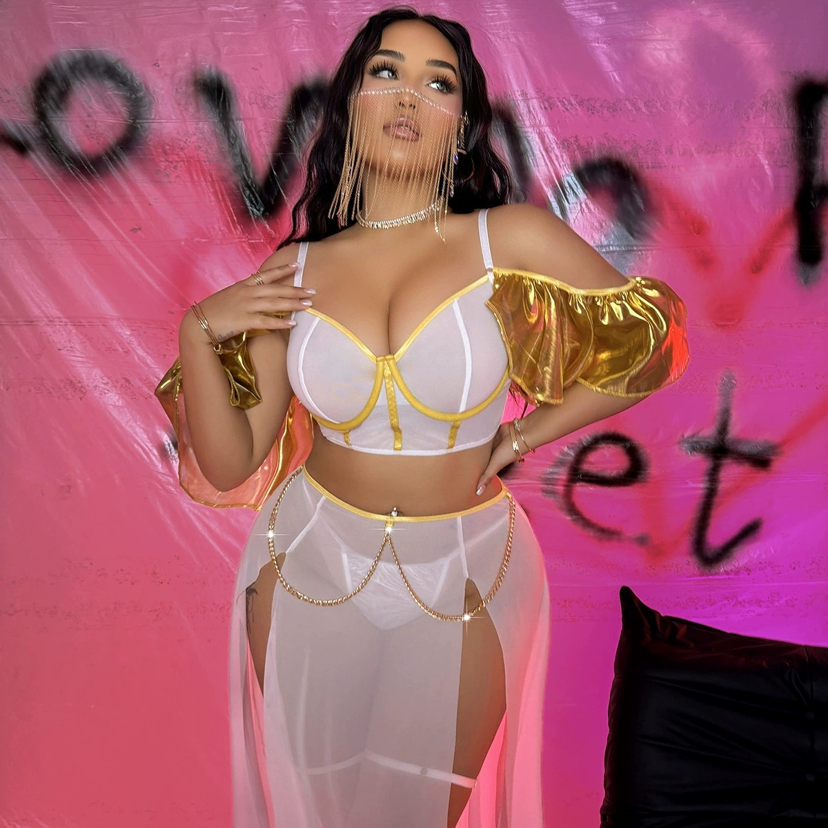 Sexy Sheer Lingerie Set for Women – Gold Ruffle Sleeve Chain Detail 3-Piece Babydoll Outfit – Plus Size Exotic Transparent Mesh Skirt Set