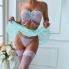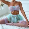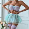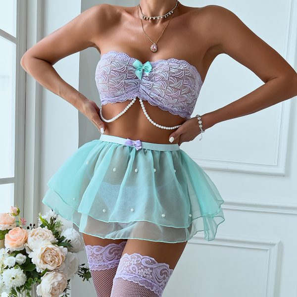 Sexy Strapless Lace Bra Set with Pearl Chain and Sheer Skirt – Purple & Mint Green Lingerie