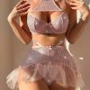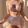 Sparkly Pink Sequin Lingerie Set for Women – 3-Piece Bra, Tulle Mini Skirt, and Panty with Halter Harness Rhinestone Shine