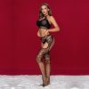 - Includes a sheer mesh crop top, cut-out garter panty, and lace-pattern thigh-high stockings—creating a coordinated and seductive look.