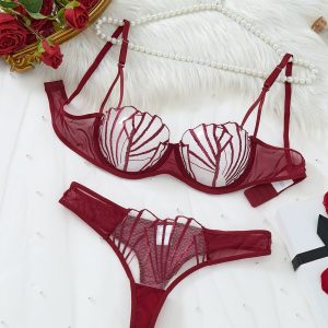 Sexy Sheer Mesh Lingerie Set for Women – 2-Piece Bra and Thong Panty with Geometric Embroidery, Underwire See-Through Bra Set, Multiple Colors