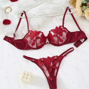 Sexy Embroidered Floral Sheer Lingerie Set – 2 Piece See-Through Bra & Thong Panty, Adjustable Straps, Heart Charm, Exotic Underwear for Women