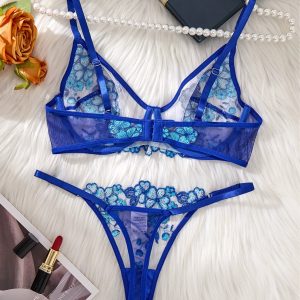 Sexy Blue Floral Embroidered Lingerie Set for Women – Sheer Mesh Bra and Thong Panty, 2-Piece See-Through Bra Set with Underwire & Double Straps