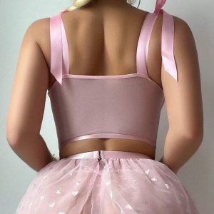 3 Piece Sweet Pink Lingerie Set with Heart Mesh Skirt – Floral Cup Bustier, Tulle Skirt Garter Thong